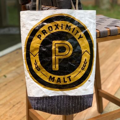 featuring repurposed brewers' malt bags, available as totes and wristlets.